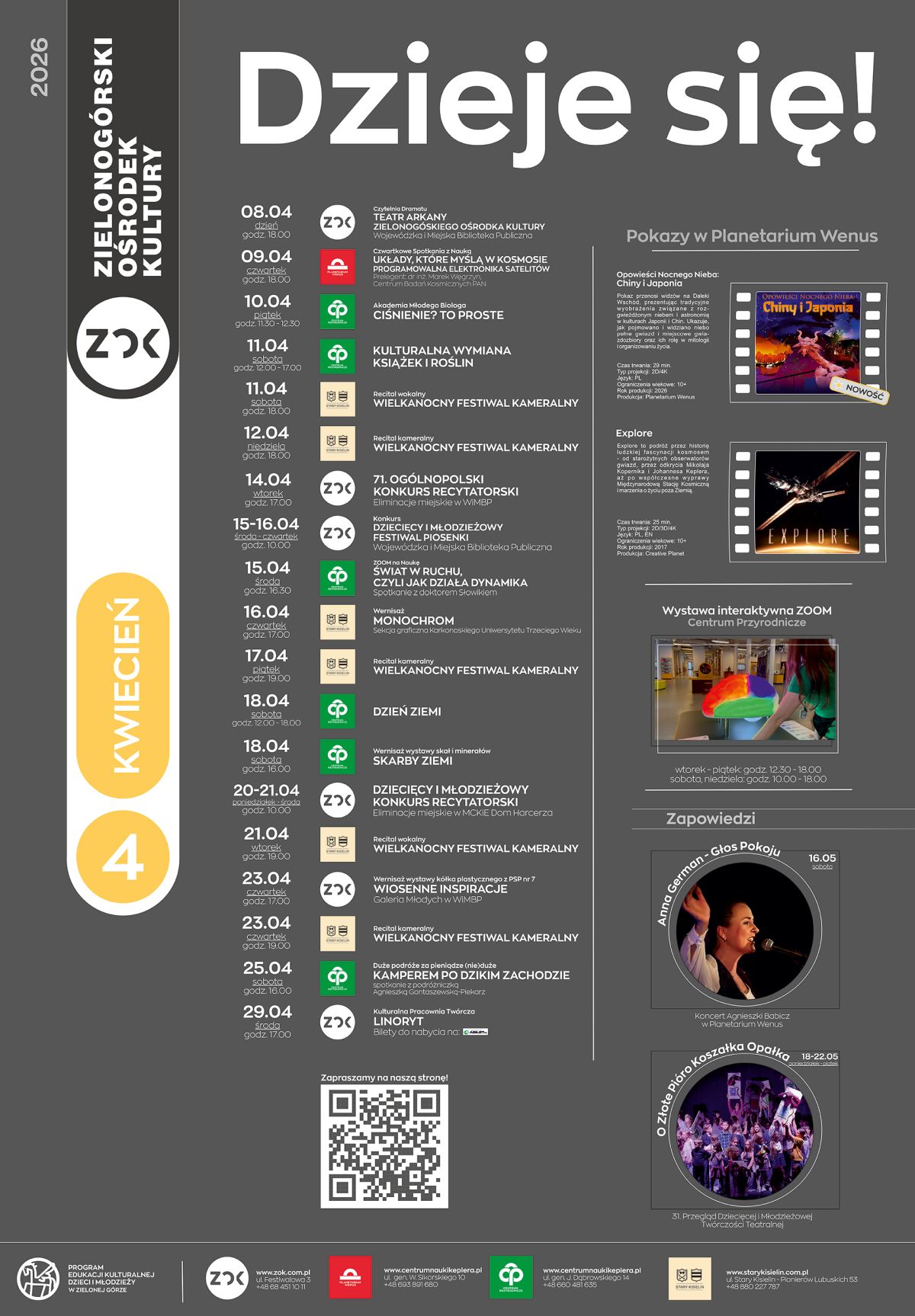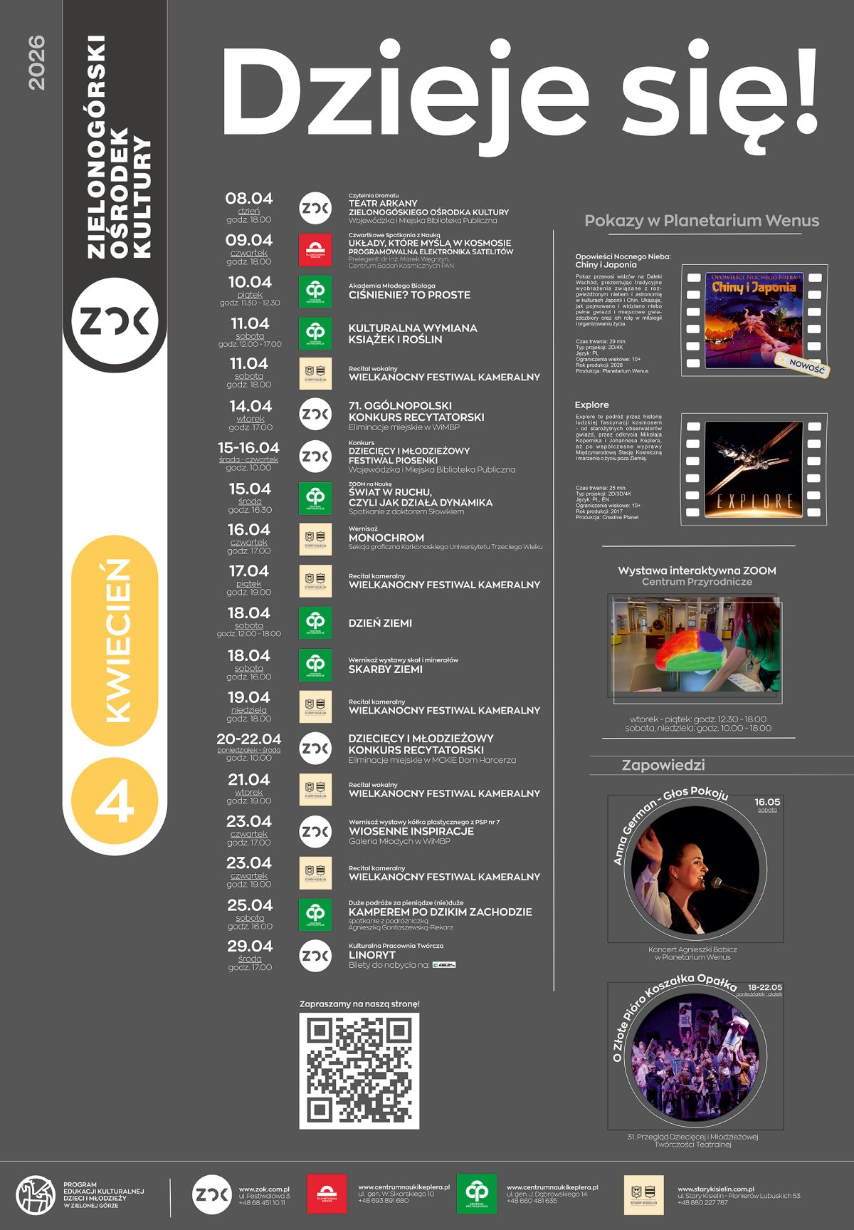 Wiosna już trwa, a kultura się nie zatrzymuje! Zielonogórski Ośrodek Kultury oraz nasze filie – Pałac w Starym Kisielinie, Centrum Nauki Keplera – Centrum Przyrodnicze oraz Planetarium Wenus – przygotowały dla Was mnóstwo wydarzeń: spotkania, warsztaty, koncerty, konkursy i wystawy. Sprawdźcie, co będzie się działo w kwietniu i zaplanujcie ten miesiąc razem z nami.