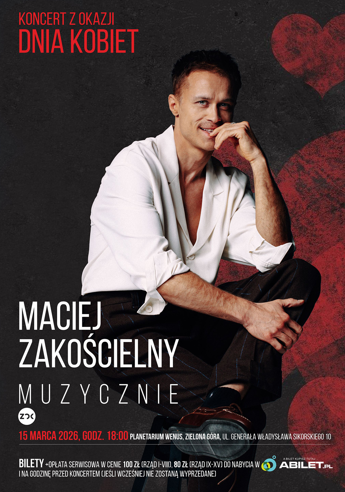 Podczas koncertu Maciej Zakościelny zaprezentuje się również jako wokalista, sięgając z wyczuciem i energią po ponadczasowe utwory jazzowe i swingowe. Od lat z powodzeniem łączy aktorstwo z muzyką, a ten koncert jest okazją do odkrycia artysty w nowym, muzycznym świetle.