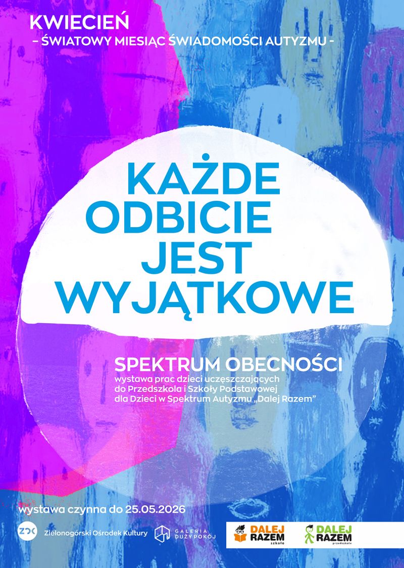 „Każde odbicie jest wyjątkowe – spektrum obecności” to wystawa prezentująca cykl piętnastu prac malarskich wykonanych na płótnach przez podopiecznych szkoły i przedszkola „Dalej Razem”. Każda z kompozycji utrzymana jest w innym kolorze, tworząc symboliczne spektrum barw. Kolory te odwołują się do różnorodności, jaka istnieje między ludźmi, a jednocześnie mogą być interpretowane jako metafora wielu odcieni emocji i sposobów przeżywania świata. Istotnym elementem prac jest zróżnicowana struktura materiałów, która wprowadza wymiar sensoryczny. Faktury, reliefy i zastosowane tworzywa zachęcają odbiorcę do bezpośredniego kontaktu z dziełem – można ich dotknąć i doświadczyć ich pod dłońmi. Ten aspekt nawiązuje do szczególnej wrażliwości sensorycznej uczniów w spektrum autyzmu oraz do indywidualnych sposobów odbierania bodźców i rzeczywistości. Motywem łączącym wszystkie prace są elementy lustrzanej folii, w których widz może dostrzec własne odbicie. Zabieg ten zaprasza odbiorcę do refleksji nad własną obecnością w świecie różnorodności. Patrząc na swoje odbicie w kolejnych kolorach, można symbolicznie zobaczyć siebie jako część większego spektrum – wspólnoty osób, z których każda jest niepowtarzalna. Wystawa zachęca do zatrzymania się, uważnego spojrzenia i doświadczenia sztuki nie tylko wzrokiem, ale także dotykiem. To zaproszenie do spotkania z różnorodnością, w której każde odbicie – tak jak każda osoba – jest wyjątkowe.